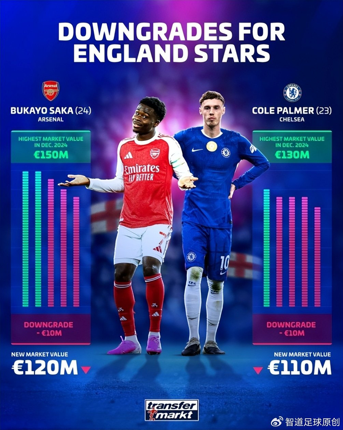 英格兰球员方面,这次德转更新英超球员身价,萨卡和帕尔默两位英格兰攻击手的身价都降低了,图赫尔2026年美加墨世界杯用人需要好好选上一选了。