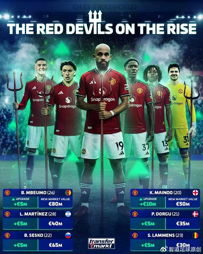曼联方面,随着卡里克上任后战绩彪悍,德转这次更新英超球员身价,曼联8人上涨,其中姆伯莫涨至8000万欧元,曼联队内第一身价;舍什科涨至6500万欧元,曼联队内第二。