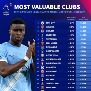 3月9日,德转更新了英超联赛球员的身价,在这次更新后,曼城的身价依然是英超第一,伯恩茅斯和桑德兰的全队总身价涨幅都超过了10%,热刺则是跌幅最大的球队。
