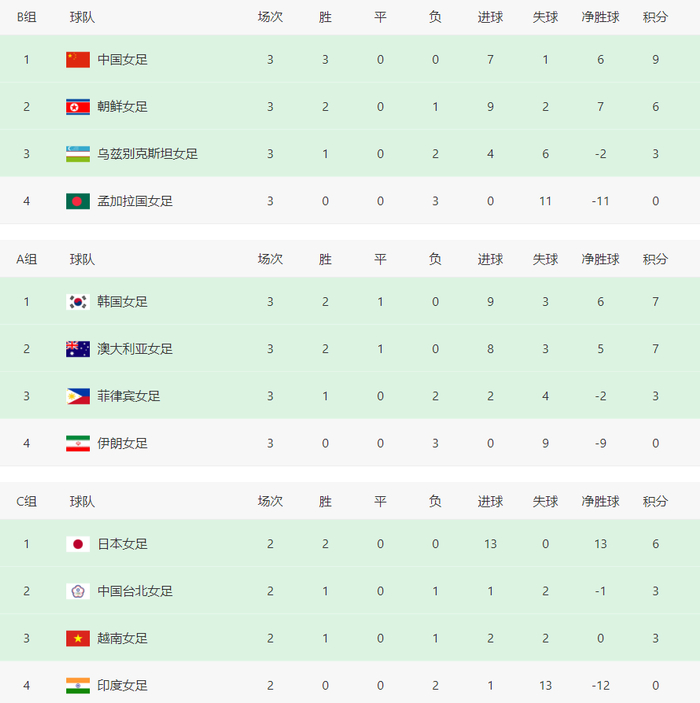 其中,乌兹别克斯坦女足是第三轮踢完之后确定晋级,本轮4-0大胜孟加拉国女足之后,确定积3分且负2个净胜球,跟A组第三的菲律宾女足一样,但乌兹别克斯坦女足的进球数多出2个,所以提前确定成为其中一个成绩最好的小组第三,锁定八强资格。