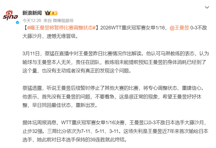北京时间3月11日,央视解说员蔡猛老师解读了王曼昱首轮游,他表示王曼昱后续可能或暂停比赛。他在直播间解读王曼昱可能身体过度消耗,教练组没有发现,运动员本身也没有主动提出这才导致了这种惨案。