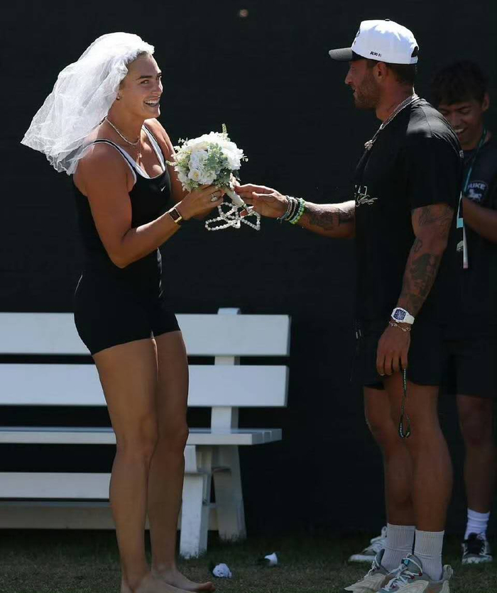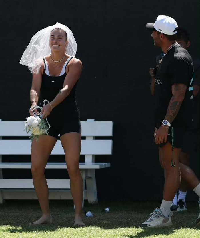 有球迷从看台递给她一个洁白的婚纱头套,这位以“虎妞”性格著称的世界第一毫不犹豫地戴在头上,继续若无其事地训练。更甜的是,她的未婚夫弗朗古利斯不仅在一旁宠溺地看着,还举着一束花配合演出 。