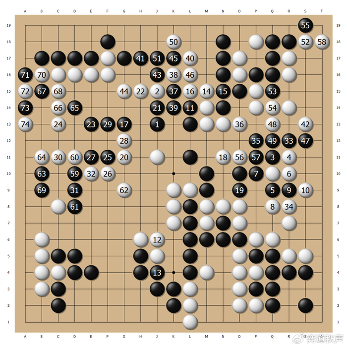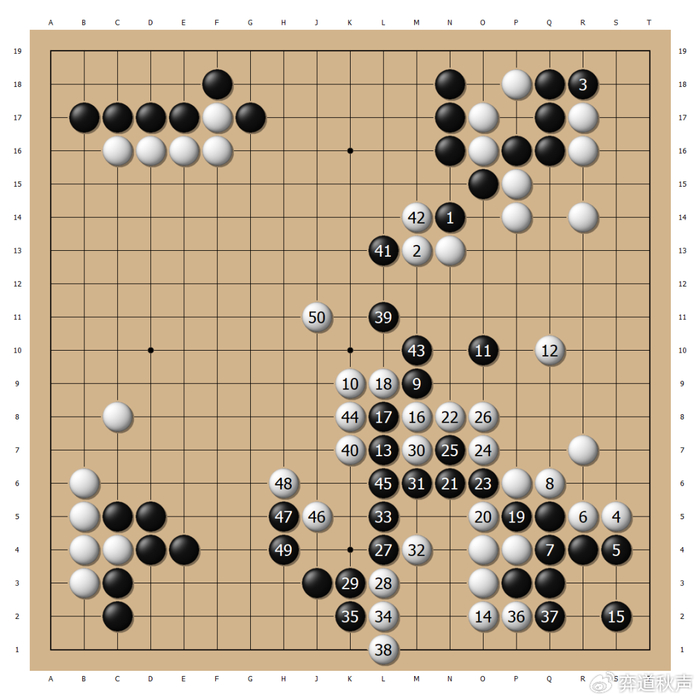 黑39只得再行骚扰,白40、42仍不肯妥协,黑43拉出,局势又有些复杂了。