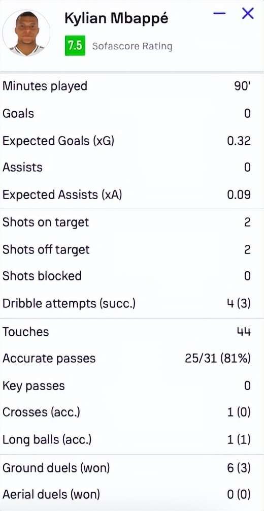 赛后,sofascore为两队球员进行打分,姆巴佩拿到7.5分,队内仅次于罗德里戈和贝林厄姆。数据显示,姆巴佩共有4次射门,2次射正,44次触球,31次传球,25次成功。