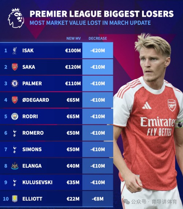3月9日,英超球员身价更新,萨卡降至1.2亿欧,帕尔默降至1亿欧,索博涨至1亿欧,伊萨克下跌2000万欧,身价来到1亿欧。
