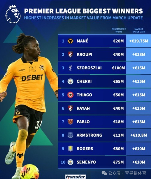 1.马内(狼队),上涨1975万欧,目前身价2000万欧