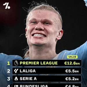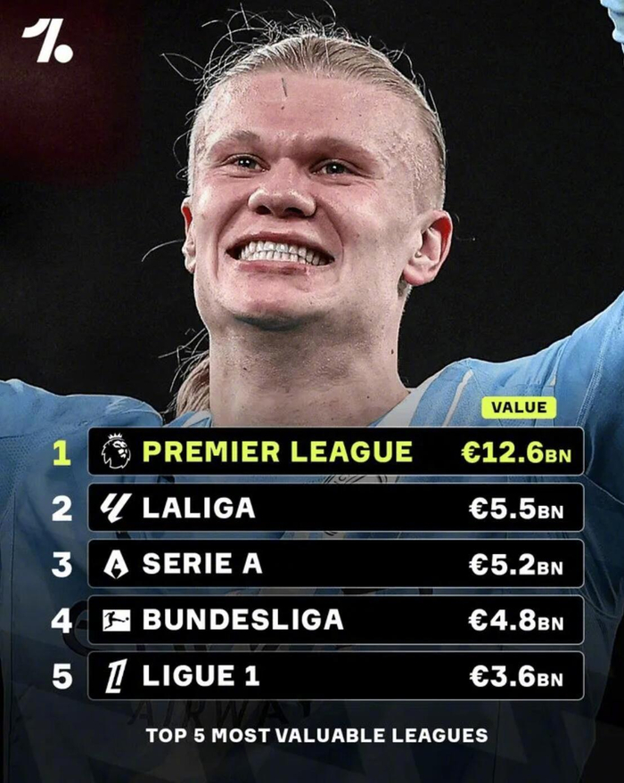 根据One Football的统计,英超联赛球员的总身价在欧洲五大联赛中断层居首: