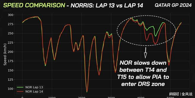 面对这种脆弱的情况,沃金车队再次要求诺里斯在第15圈帮助队友,从GPS数据上可以看出,英国人在DRS检测点之前14号和15号弯都收了油门,以便让队友可以再次靠近自己,这一点通过对比诺里斯在第13圈和第14圈的GPS数据就可见一斑。