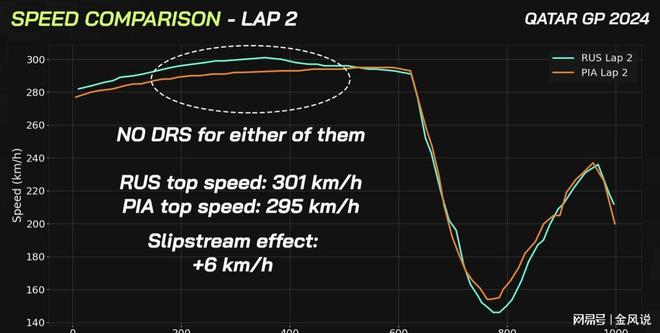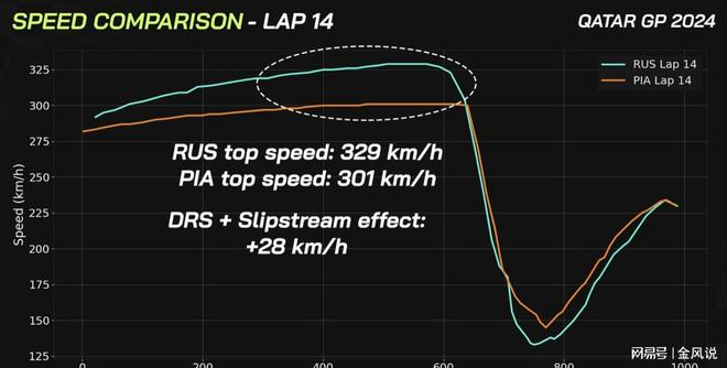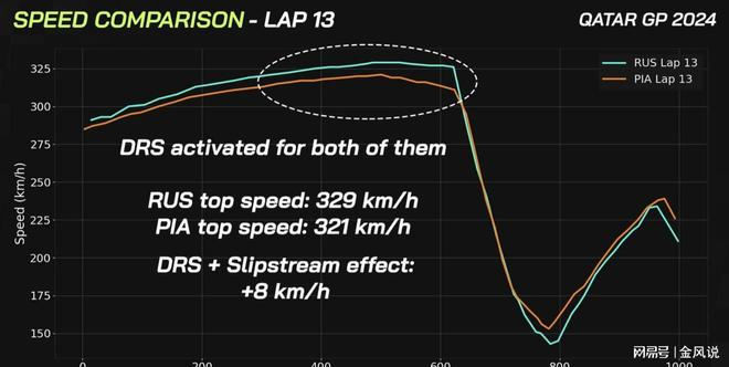 从GPS数据看,在冲刺赛第二圈,两人都没有DRS可以用,拉塞尔的尾速要比皮亚斯特里高出6公里每小时,这意味着他在一号弯前能以尾速优势迅速拉近他与澳洲人之间的差距,而且车队也从遥感数据中发现了这一点,因此从第五圈开始,车队决定让诺里斯略微放慢速度,以便于让身后的皮亚斯特里能够进入自己的DRS范围之内,这样就可以有效防止拉塞尔的超越,但从GPS数据看,在第13圈,两人均在打开DRS的情况下,拉塞尔的尾速仍要比皮亚斯特里高出8公里,虽然这不足以让后面的拉塞尔能够在1号弯实现超车,但他仍可以凭借尾速方面的优势迅速拉近距离。