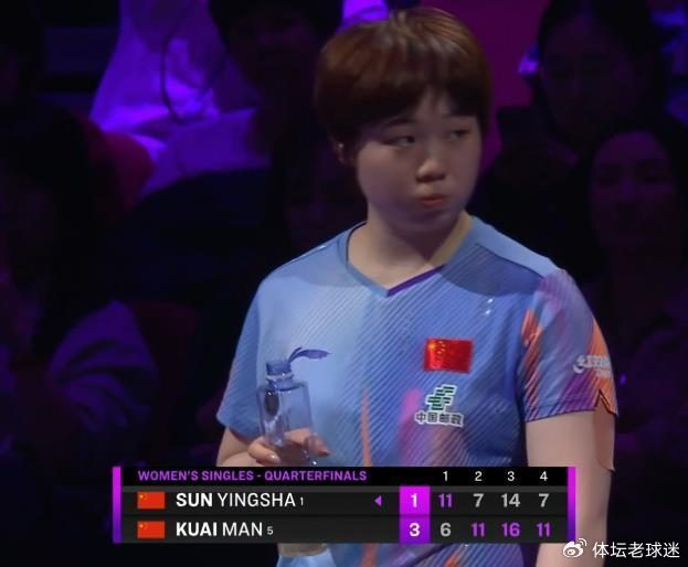 蒯曼击败孙颖莎,挺进WTT重庆赛4强!北京时间3月14日,WTT重庆冠军赛女单1/4决赛中,上演了一场备受瞩目的国乒内战。面对全场给予孙颖莎山呼海啸般的加油声,以及自身带伤的不利局面,蒯曼没有手软,经过六局激战,以4-2爆冷击败了世界第一、队友孙颖莎,强势挺进女单四强。六局比分为:6-11、11-7、16-14、11-7、9-11、11-2。这场比赛,不仅仅是比分上的4比2,更是一场心理与意志的终极对决。