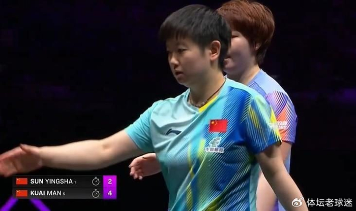 第二局,孙颖莎再次取得4-0的完美开局。然而,这一次蒯曼没有慌乱。她在中局阶段连得5分实现反超,并在7平后连下4分,以11-7扳回一局,将大比分改写为1-1。
