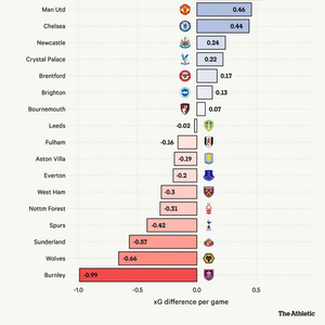 TA盘点了2025-26赛季英超各队的非点球预期进球差(xGD)数据,阿森纳以0.89高居榜首,明显领先其他球队,展现出极强的整体压制力。
