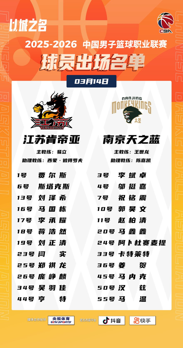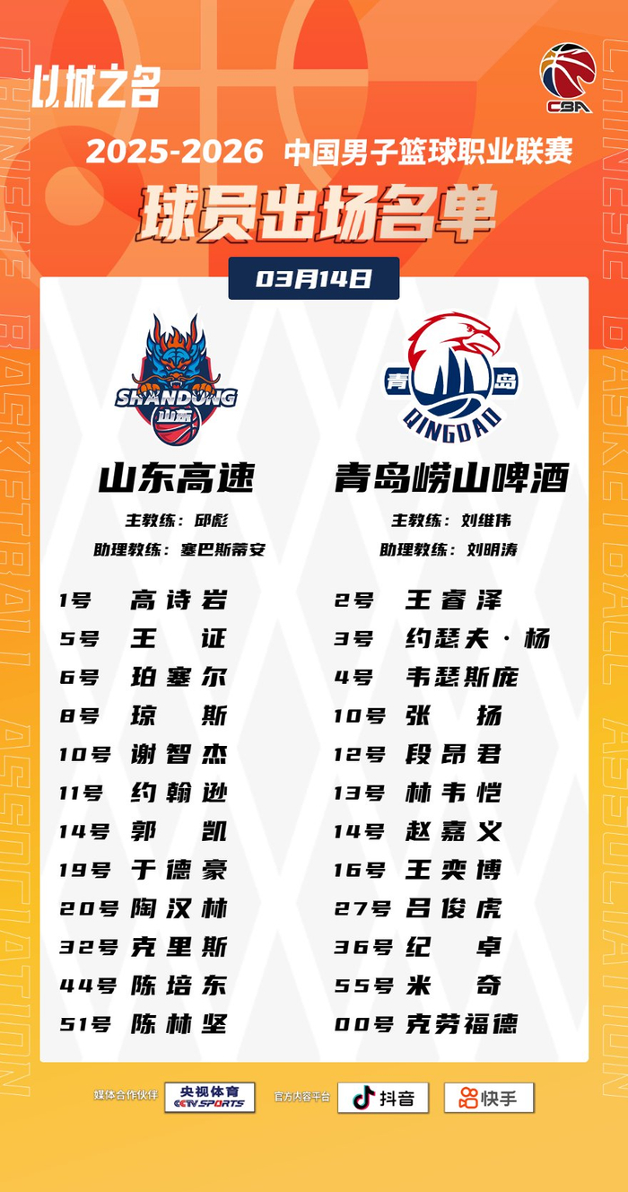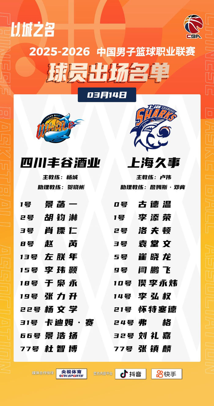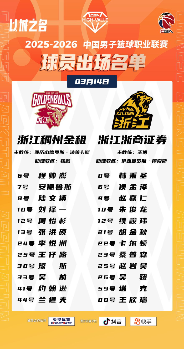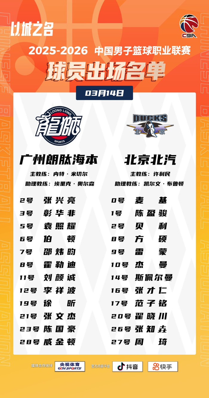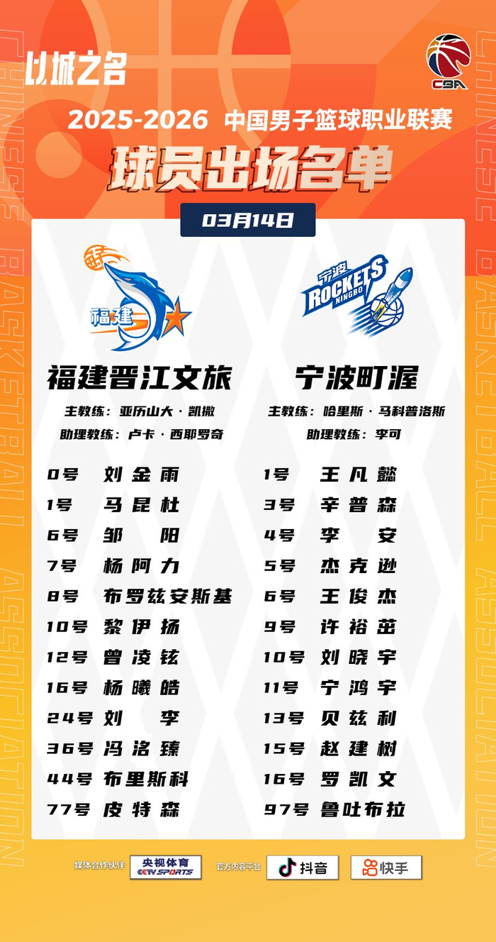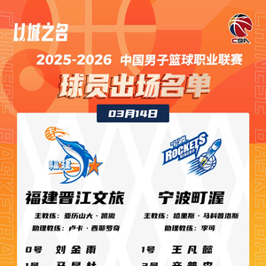 大名单出炉 CBA聚焦 03.1419:10 关注 #CBA[超话]# 【大名单出炉】2025-2026赛季CBA联赛常规赛第二十五轮今晚继续进行,6场比赛将在19:35同时跳球。敬请期待!#以城之名##竞由新生#