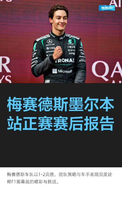 梅赛德斯在墨尔本阿尔伯特公园赛道实现“一二带回”。拉塞尔凭借杆位发车优势,结合精准的能量管理策略,全程压制法拉利车手勒克莱尔;新秀安东内利克服起步失误,从第七位追至亚军。车队在虚拟安全车时果断双车进站,奠定胜局,领先第三名超30秒。
