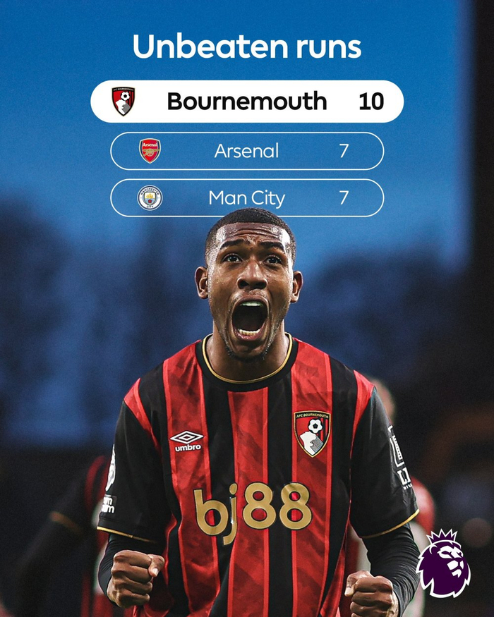 据统计,本场比赛过后,伯恩茅斯目前保持着近期英超最长的连续10场不败纪录,超同期连续7场不败的阿森纳和曼城