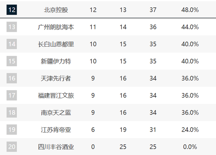 北控则巩固住了第12的位置,这轮他们击败了天津,并且领先第13的广州一个胜场。现在广州已经两连败了,他们要抓紧点了。