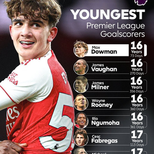 北京时间3月15日,在英超第30轮的比赛中,年仅16岁的小将道曼用进球帮助阿森纳主场2-0击败了埃弗顿,他本人也成为了英超有史以来最年轻的进球者。