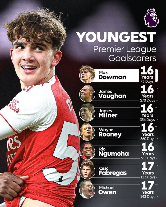 赛后英超官方列出了联赛历史最年轻的7位进球球员,道曼以16岁73天的年纪排名第一。