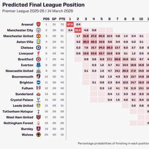 超算预测英超夺冠概率:阿森纳97.6%,曼城2.4%,其余18队0%