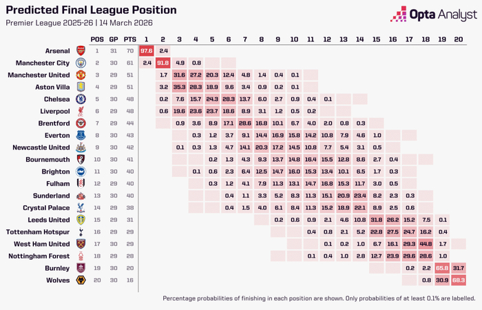 Opta运用超算预测英超本赛季夺冠概率,具体如下:阿森纳97.6%,曼城2.4%,其他队均为0%。