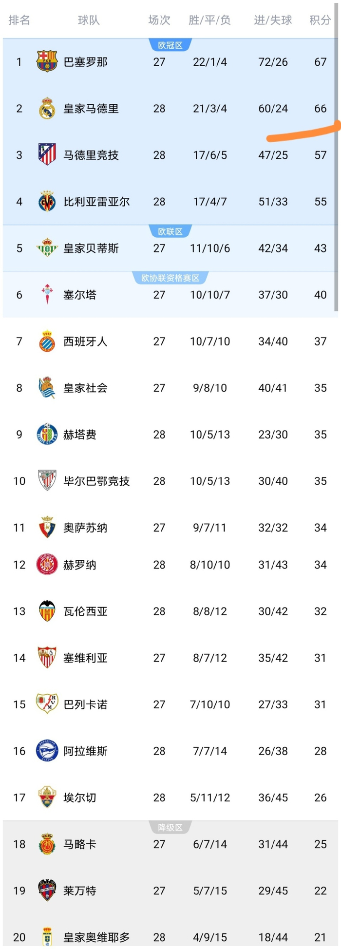 随着皇马4-1,瓦伦西亚0-1,马竞1-0,赫罗纳3-0,西甲最新积分榜出炉