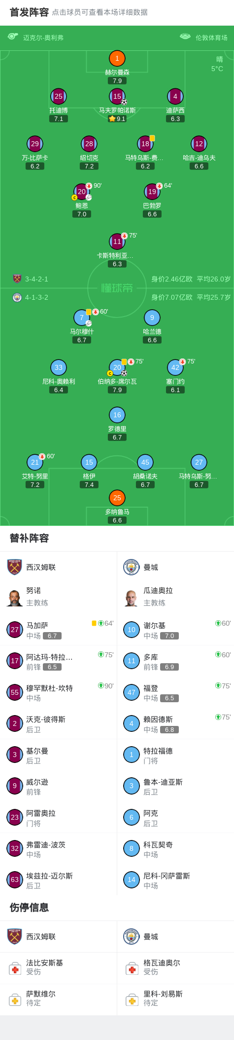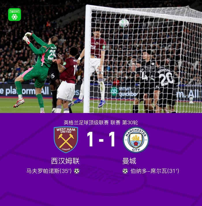 第35分钟,马夫罗帕诺斯头球破门,西汉姆联1-1闪电扳平曼城
