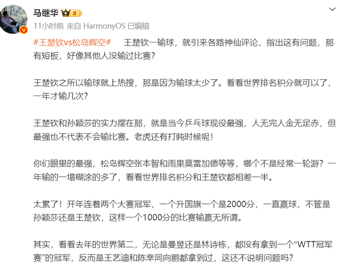 马继华老师专门发推批判那些质疑王楚钦的声音,他表示:王楚钦一输球就引来各路神仙的评论,好像其他人就没有输过球?王楚钦输球就上热搜是因为输球太多,看看世排积分就知道,一年才输几次?王楚钦与孙颖莎实力摆在那,开年连着两个大赛冠军太累了。