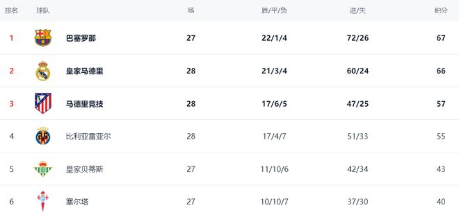 在积分榜上,巴萨依然高居榜首,战绩是22胜1平4负,拿到67分。皇马赢球之后,总积分达到66分,仅仅落后巴萨1分,屈居第2名。不过,皇马比巴萨多踢1场。显然,巴萨还是占据夺冠主动权。马竞赢球之后,总积分达到57分,排名升到第3。而比利亚雷亚尔以55分排名第4。第5的是皇家贝蒂斯,只拿到43分,想要进一步提升排名基本是不可能的事情。