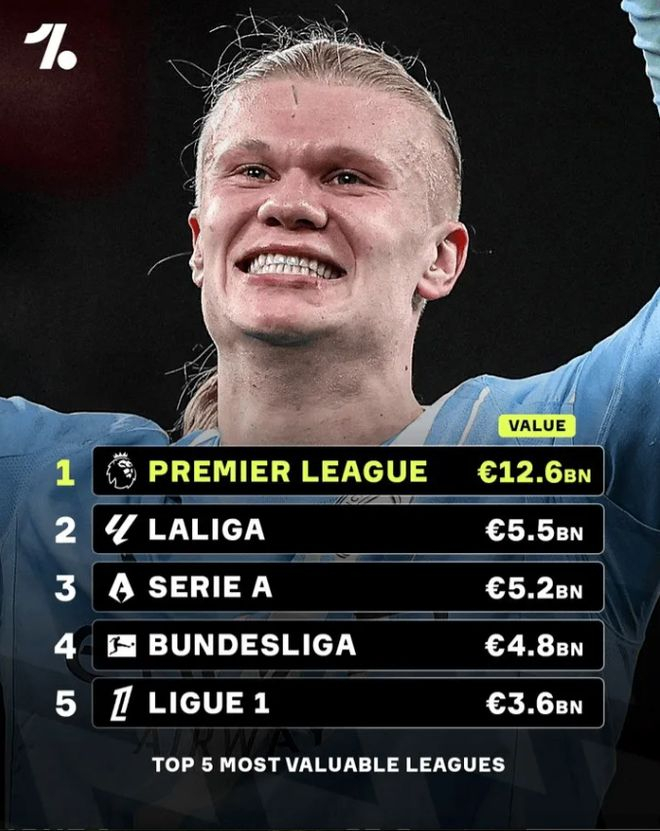据OD最新体育显示,英超联赛在欧洲五大联赛中的球员总身价高达126亿欧元,几乎是西甲的两倍多,彰显了英超在全球足球市场的强大经济实力。