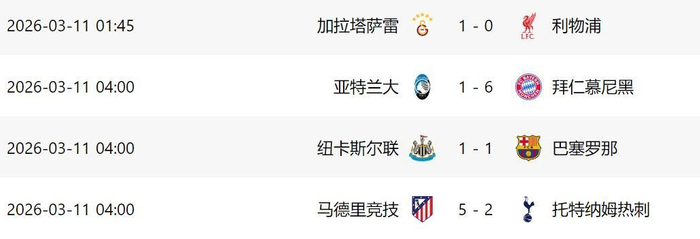 北京时间3月11日,欧冠淘汰赛首回合比赛,拜仁、马竞、利物浦和巴萨等豪门出战,结果拜仁和马竞分别大胜对手,而利物浦和巴萨则都没能取胜,下周中能否晋级还有悬念。