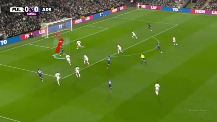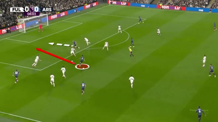 在这个进攻回合的最后阶段,赖斯展示了他进化后的视野。他没有选择安全地回传以保住球权,而是送出一脚高速的、穿透防线的传球,直接撕裂了对手的最后一道防线。这种果断的传球证实了他作为阿尔特塔战术体系中“尖刀”的地位:一名能够凭借一个单一的技术动作,将一次普通的阵地控球转化为绝佳得分机会的球员。