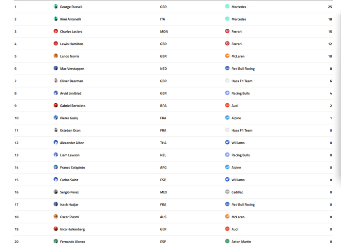 车手积分榜上,拉塞尔25分暂列第一,安东内利18分第二,勒克莱尔15分第三,汉密尔顿12分第四,诺里斯10分第五,维斯塔潘8分第六。