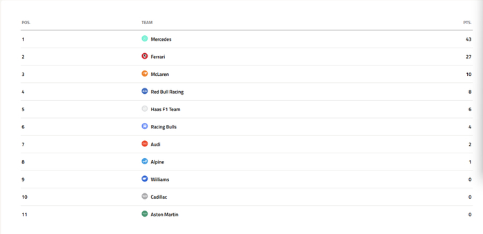 车队积分榜上,梅赛德斯43分第一,法拉利27分第二,迈凯伦10分第三,红牛8分第四。