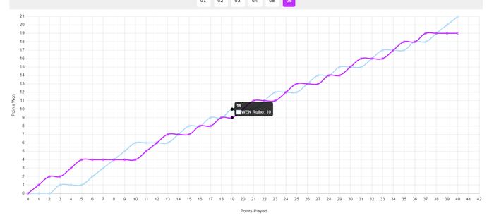 这场比赛的第六局张本智和已经很能扛了,张本智和9-10、11-12、13-14、14-15、15-16、16-17挽救了足足6个赛点,最终才19-21惜败。