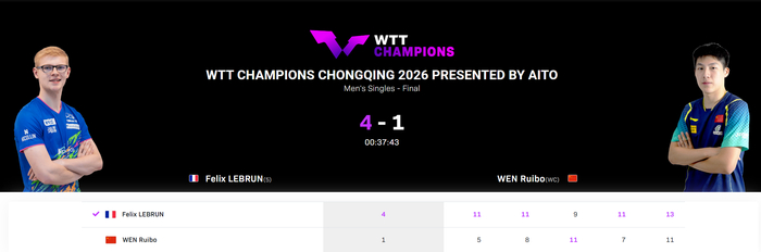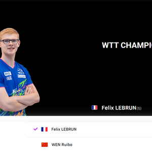 北京时间3月15日,WTT重庆冠军赛男单决赛,温瑞博1-4不敌小勒布伦,法乒一哥小勒登顶成功,五局比分:5-11、8-11、11-9、7-11、11-13。虽然温瑞博未能一黑到底,到冠军赛亚军700分,他的世界排名升至第18。
