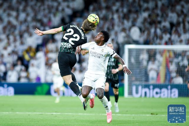 ↑ 皇家马德里队球员维尼修斯(右)和埃尔切队球员阿芬克鲁伯争顶。