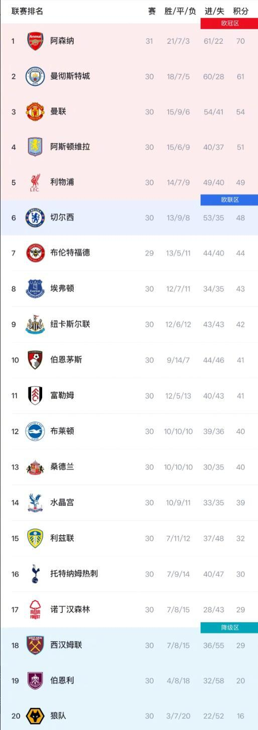 英超联赛进入第30轮,争冠格局逐渐明朗,阿森纳本轮主场2-0战胜埃弗顿,积70分稳居榜首,领先曼城9分,进一步巩固了冠军优势。曼城本轮1-1战平西汉姆联,追赶压力骤增。与此同时,曼联凭借3-1战胜维拉稳固了第三位,目前积54分。
