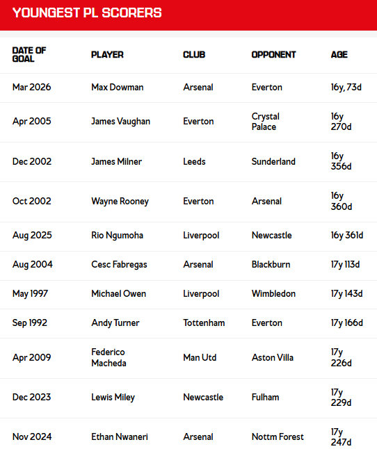 阿森纳官推:凭借对阵埃弗顿的进球,马克斯·道曼创造了英超联赛历史,成为该赛事最年轻的进球者,打破了一项尘封二十年的纪录。