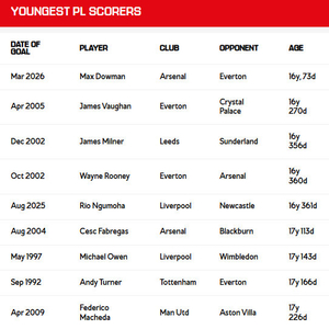 去年8月在对阵利兹联的比赛中上演首秀时,这位当时年仅15岁的边锋便成为联赛第二年轻的出场球员——仅次于我们自家的埃登·海文。但此番攻破埃弗顿球门后,我们俱乐部现在同时拥有英超1992年成立以来最年轻的出场球员和进球者。
