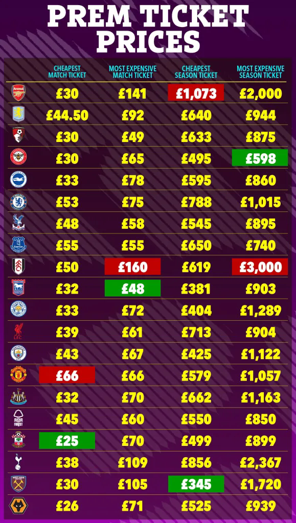 影响球票价格变化因素很多,包括俱乐部地理位置、上赛季成绩、历史地位、对手强弱等。平均收入最高的伦敦票价普遍较高,其他地区票价较低。但曼彻斯特和利物浦因俱乐部历史成绩更好,票价更贵。传统豪门近年票价上涨,球票供不应求是主因。俱乐部当前成绩也会导致球票上涨,上赛季和本赛季阿斯顿维拉、纽卡斯尔联均因进入欧战,票价对应提高了3%至5%。因对手不同票价也有差别,以阿森纳主场上层中心区零售票价为例,处于68-168欧元(570-1400元)之间。较低价适用于对弱旅,较高价适用于对争冠对手曼城或德比死敌热刺。