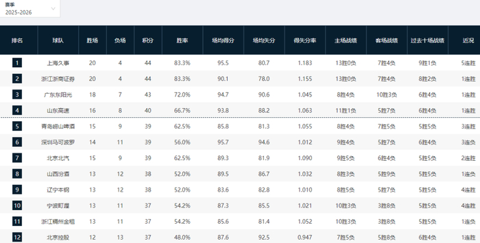 CBA排名又乱了!上海杀回第一,广东双杀深圳,辽宁四连胜卷土重来