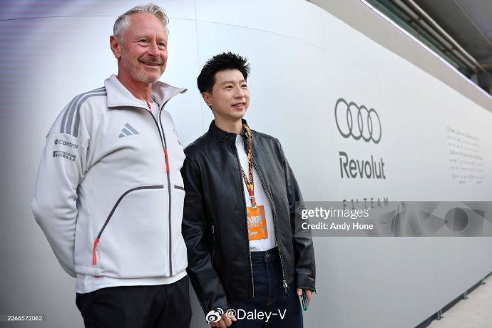 马龙与奥迪F1车队领队Jonathan Wheatley展开长时间交流。尽管具体内容未公开,但合影中两人神态轻松,似在探讨竞技体育与赛车技术的共通哲学——精准控场、毫秒决胜。