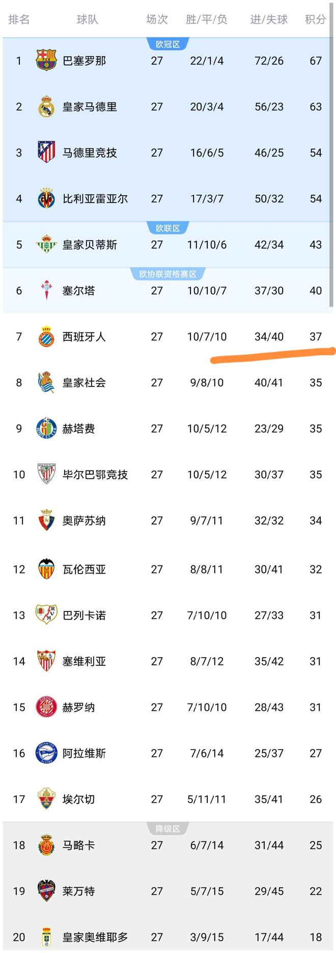 这场比赛之后,所有西甲球队都已经踢完了西甲第27轮的比赛,西甲积分榜发生变化,我们来看看。