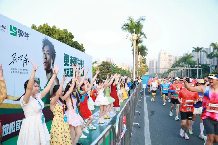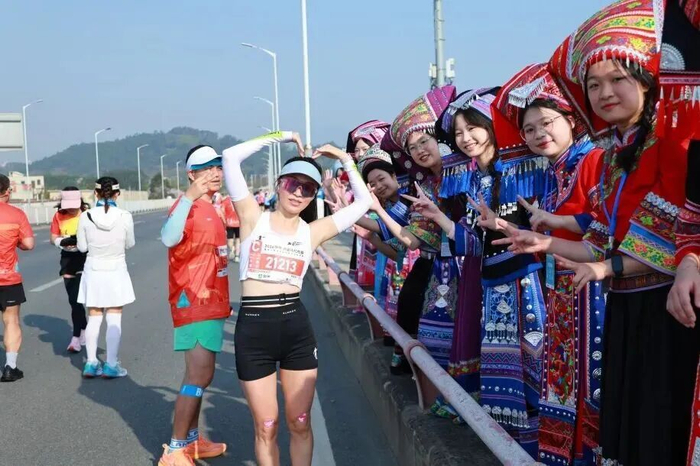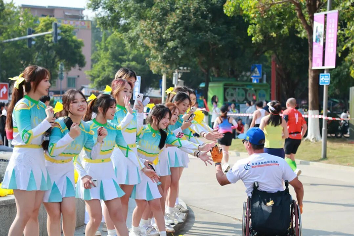 为了营造浓厚的赛事氛围,组委会在赛道沿线设置展演、加油、打卡氛围点共计61处。两座大桥上,身穿壮、瑶民族服饰的“清马宝贝”啦啦队与跑者们击掌助威;广东岭南职业技术学院内的“超长”氛围点,用长达1公里的热情与青春活力把气氛“拉满”,助力跑者们一路向前。