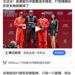 - 海内外传播的“双标”争议:F1中国官博发布完整四人合影并标注吴艳妮身份,但海外Instagram账号却将同一照片裁切,仅保留她的一只手臂,且文案未提及嘉宾。这一操作引发国内观众批评,认为是对中国体育代表的不尊重。
