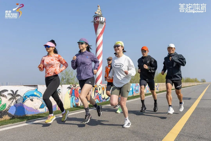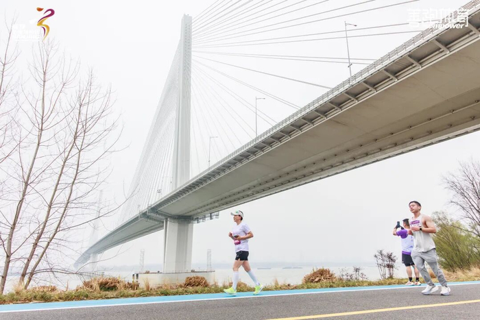 中新南京生态科技岛坐落于长江主航道之间,四面皆被江水环绕,造就了这条赛道可以看到长江映日、江豚逐浪、灯塔引航的独特自然景观。得天独厚的区位,也让选手在奔跑时,恰好可以与城市发展的现代化图景同框——在夹江侧的江堤,尽览国际化河西新城的摩登天际线;在大江侧江堤,可以远眺国家级江北新区的崭新风貌。