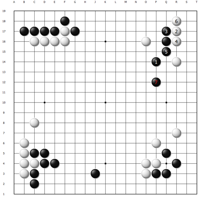 这样白棋顺势将一串先手交换,黑棋大龙岌岌可危。至130手,黑棋最后的机会同样是在O13扳出,可以说这盘棋失利的根本原因之二是申真谞始终忽略了O13扳出后的后续手段,以及给白棋制造麻烦的严厉程度。