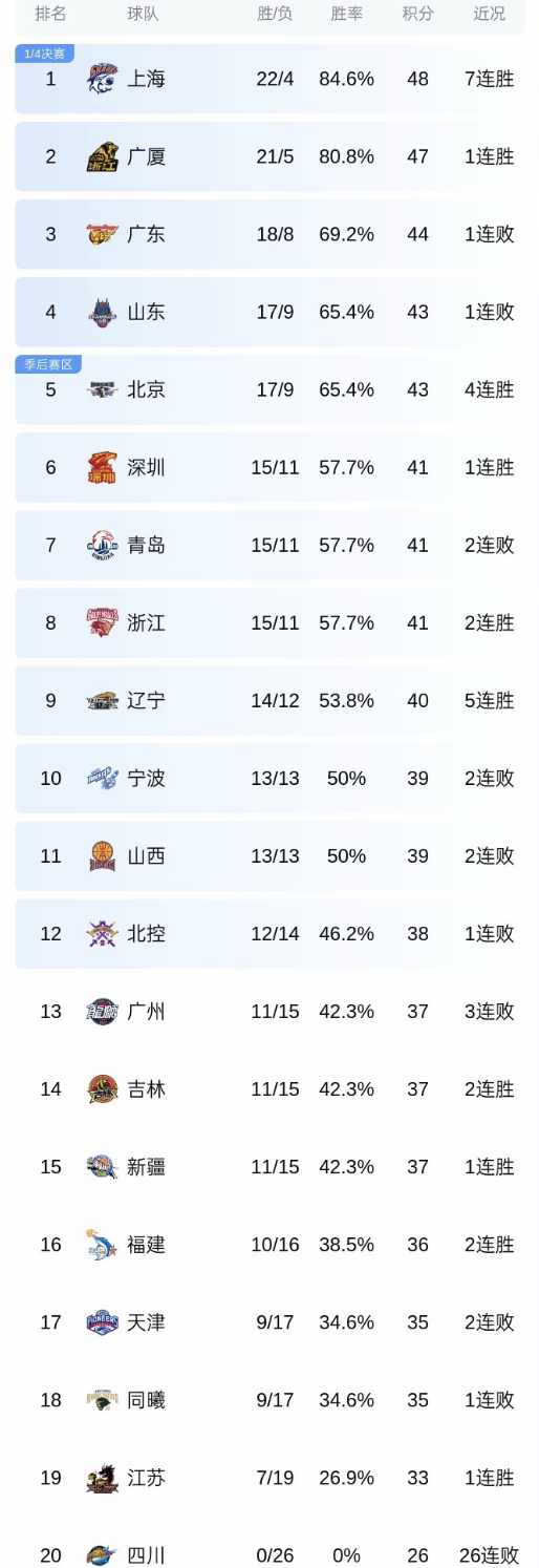 CBA积分榜更新,上海队继续领跑,北京的战绩追平山东。大家说上海今年能捧起总冠军吗?