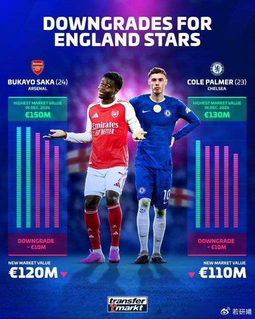 德转在3月9日更新了英超球员身价,萨卡和帕尔默都下跌1000万欧元,一个从1.3亿掉到1.2亿,另一个从1.3亿降到1.1亿,这两人原本是阿森纳与切尔西各自的招牌年轻球员,现在市场认为他们近期表现不够稳定,并不是说他们没有实力,而是大家对持续输出的要求变得更高了。