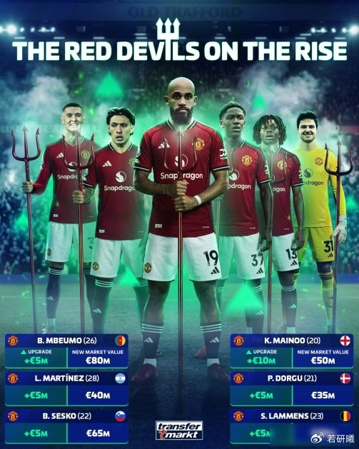 曼联这次让人有点意外,队里有八名球员的身价都涨了,姆伯莫升到八千万欧元,成了球队里最值钱的球员,他在联赛进了十五个球,比之前那些年轻前锋表现稳定多了,托纳利和苏维门迪的身价也往上涨,不是因为球队战绩好,而是现在中后场能传球、控制节奏的球员太少,曼联虽然排名不怎么样,但这些人对球队的帮助大家都能看到。
